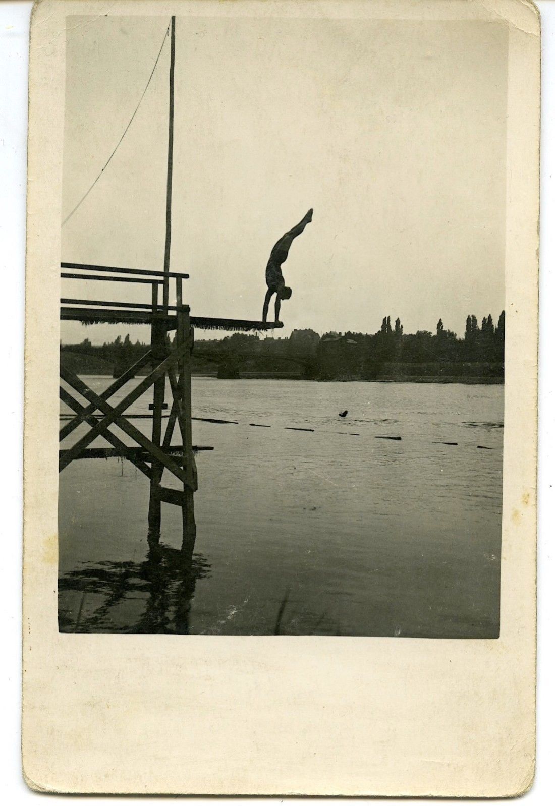Vintage snapshot of a man doing handstands on a diving board at dawn, 1927 / src: eBay
