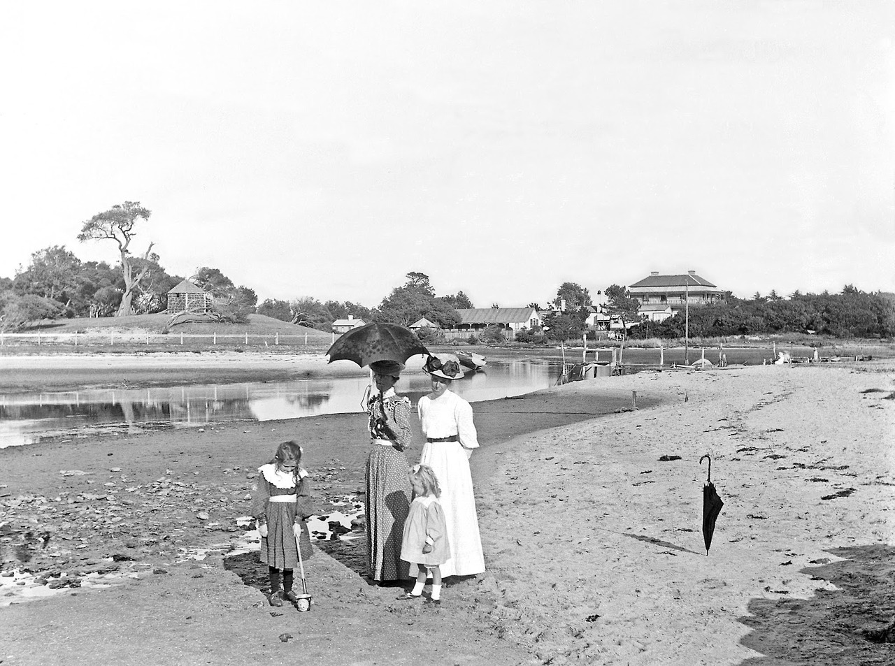 Two unidentified women with girls at a beach. And a weird black umbrella! ca. 1890′s / via