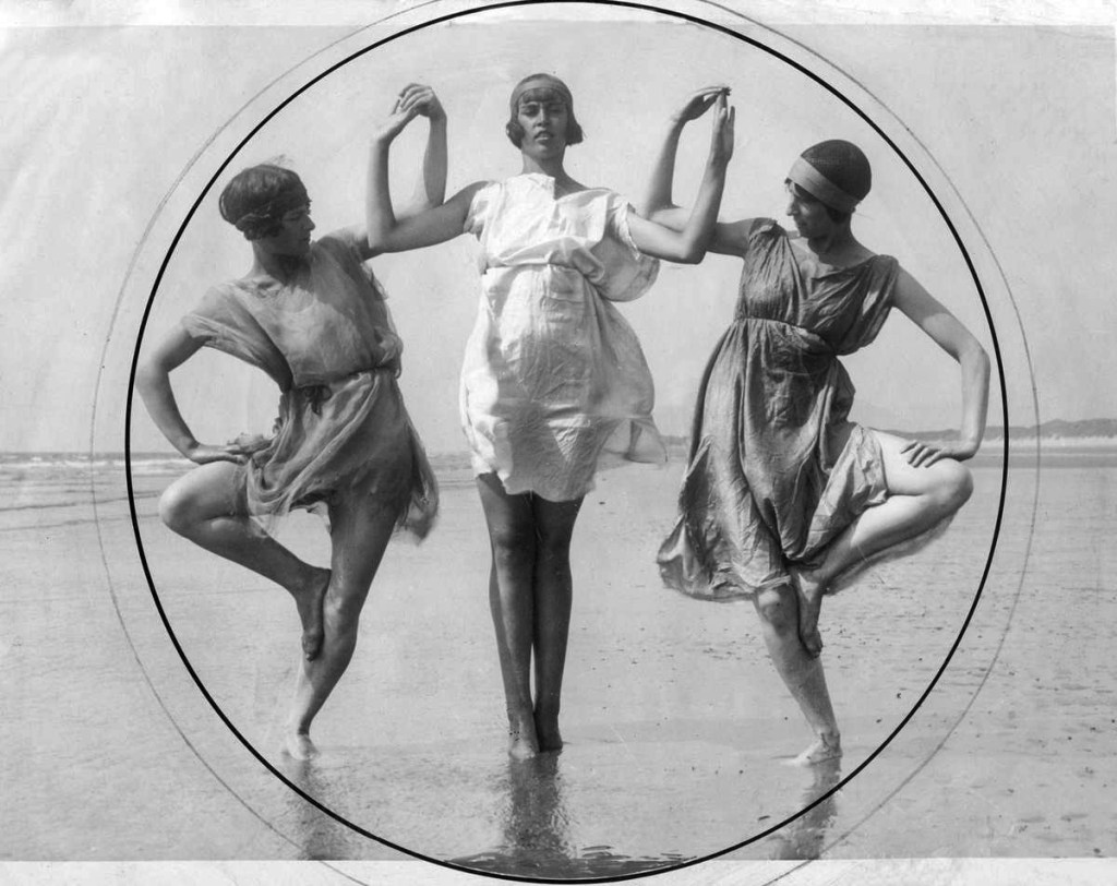 Strandleven. Danseressen van de Margaret Morris Summer School dansen op het strand in Noord-Wales, het Verenigd Koninkrijk, 1921. | Beach life. Dancers from the Margaret Morris Summer School dancing on the beach in North Wales, United Kingdom, 1921. | src Fotocollectie Het Leven