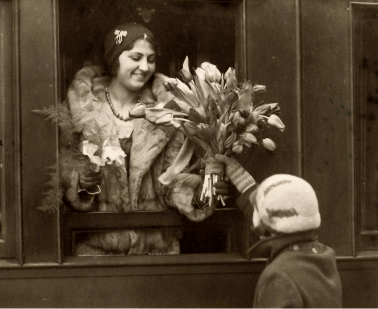 Mary Lelyveld, Miss Holland 1931 departs by train from Amsterdam to Paris to participate in the Miss Europe pageant 1931. When she leaves, she is offered a large bouquet of Dutch tulips. | src Het Geheugen. Fotocollectie Het Leven