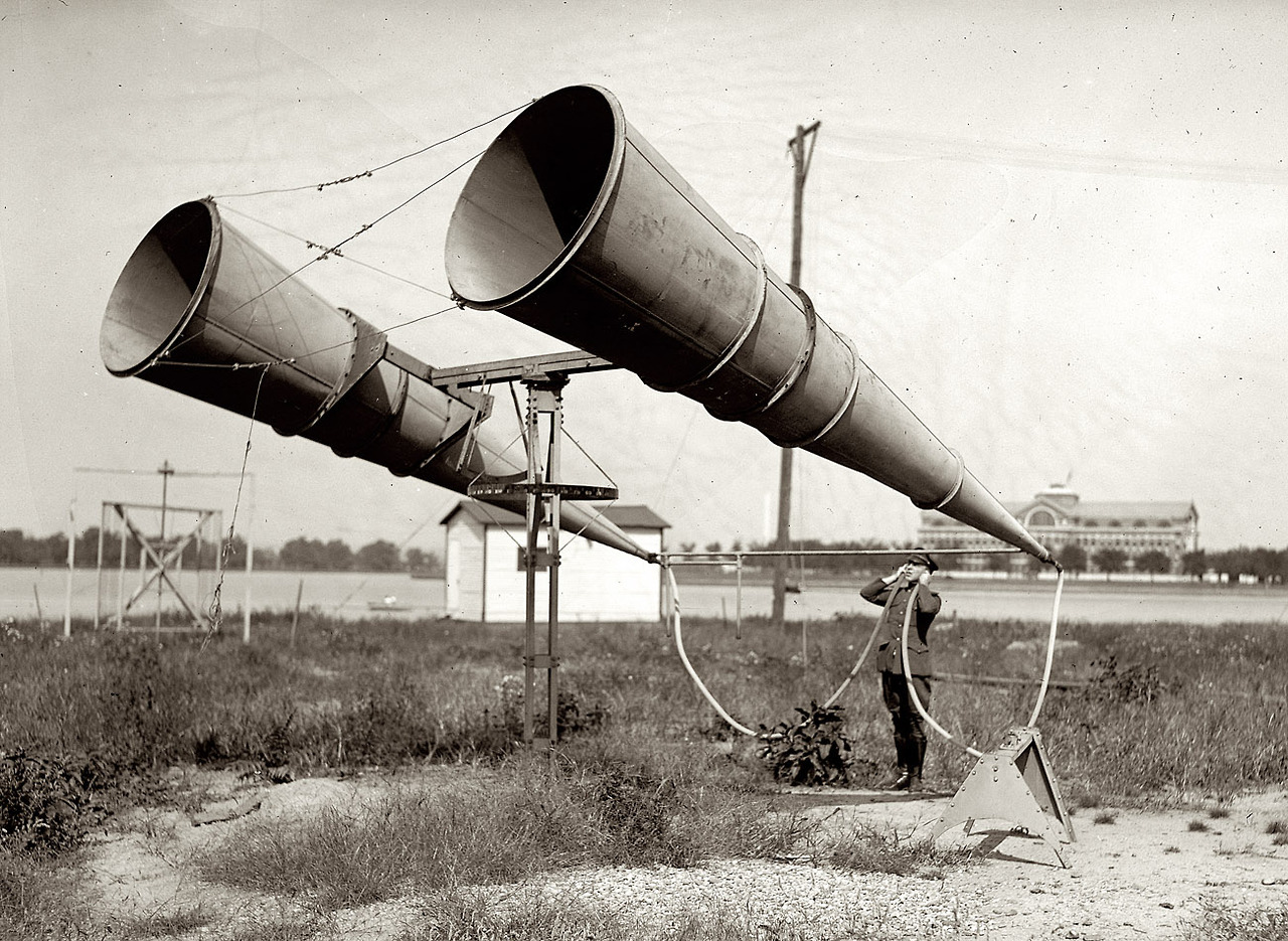 “Amplifiers at Bolling Field, 1921.″ Two giant horns with ear tubes, evidently designed to listen for approaching aircraft. National Photo Co. / source and hi-res: Shorpy