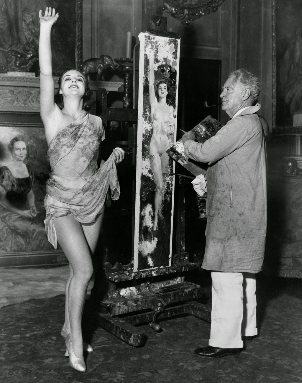 Howard Chandler Christyat work. Dorothy Knapp modeling for “The Water Nymph,” Christy Garden Apartments, Woodside, Long Island, 1925.