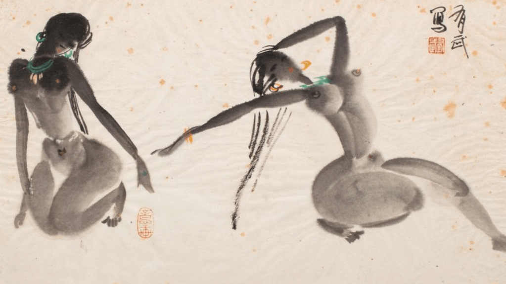 Sitzender Akt mit erhobenen Armen. Lav. Tuschz. Sign. ‘H. Gehri’ u. dat. 1912. | Sitting nude with arms raised. Ink drawing. Signed “H. Gehri” and dated 1912. | src Kiefer Buch und Kunstauktionen