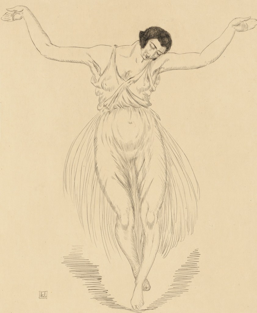 The drawing shows a lady of advanced age, her head in strict profile to the left, the body from the front. She wears an expansive light brown dress with light blue trimmings and bows. The parasol is also made to match the blue borders and bows. The light green turban with two opulent white feathers, which are held by a golden brooch with an orange-red stone, is striking. | src Bassenge Auktionen