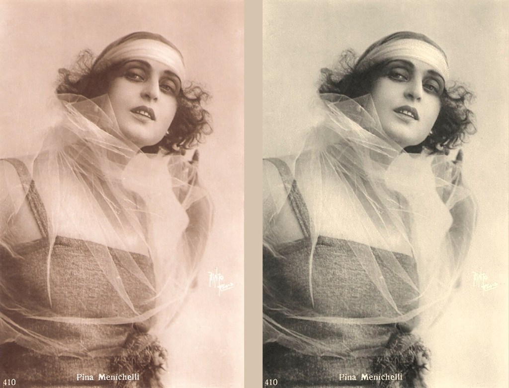 Alternative renditions of a card: Pina Menichelli. Italian postcard by Ed. A. Traldi, Milano, nº 410. Photographer: Pinto. sources: left: Truus, Bob & Jan on Flickr | right: Museo nazionale del cinema di Torino