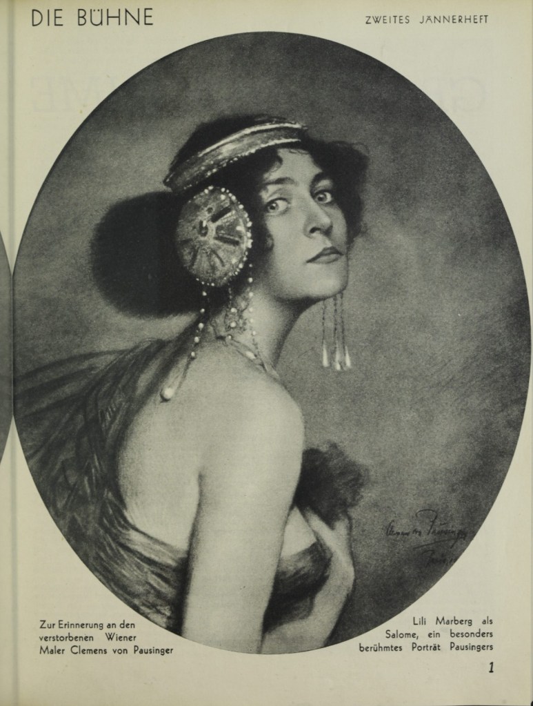 Zur Erinnerung an den verstorbenen Wiener Maler Clemens von Pausinger. Lili Malberg als Salome, ein besonders berühmtes Poträt Pausingers. | In memory of the late Viennese painter Clemens von Pausinger. Lili Malberg as Salome, a particularly famous portrait by Pausinger. Published in Die Bühne, 1936, Heft 416. | src Österreichische Nationalbibliothek