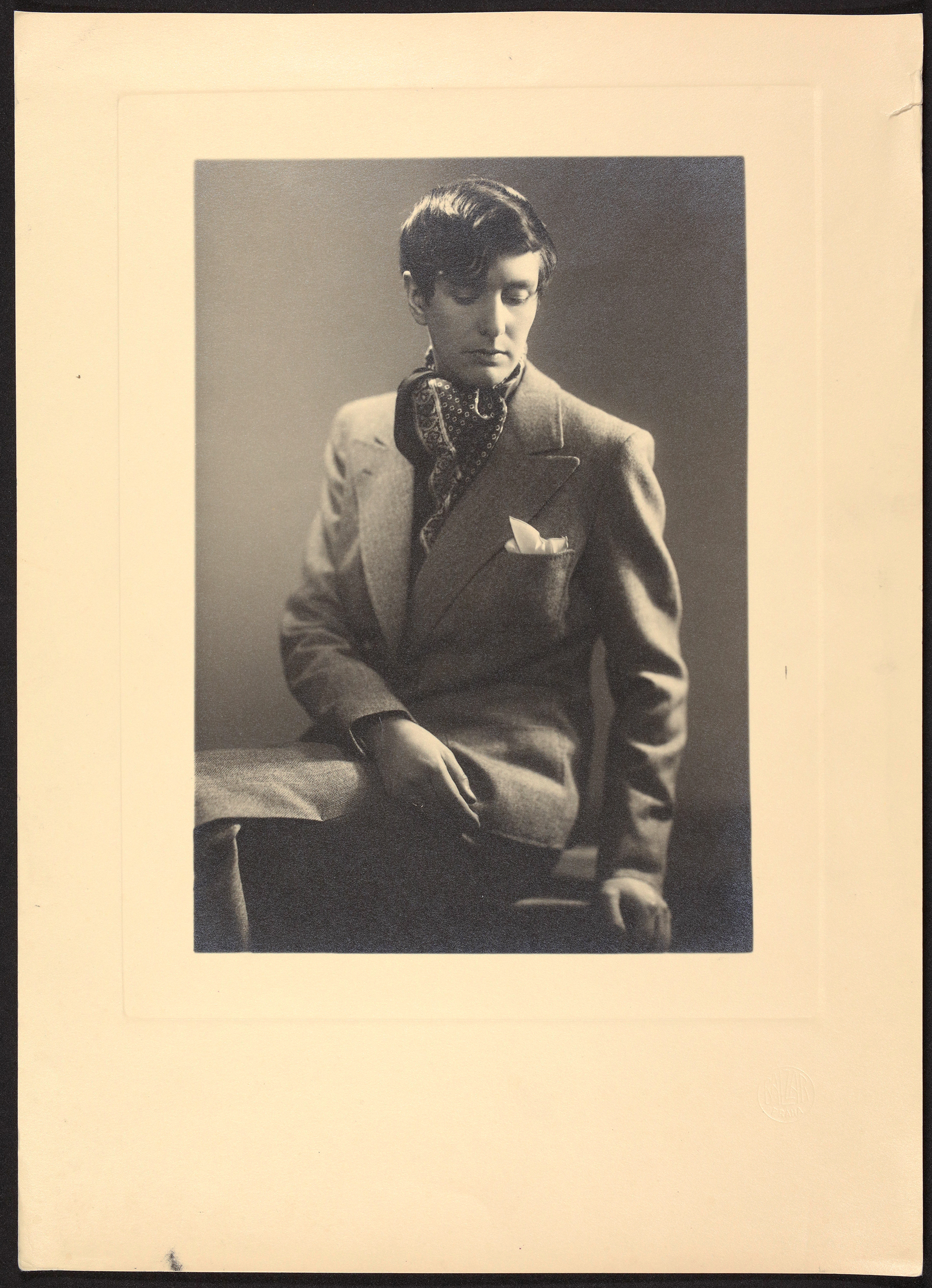Berenice Abbott:: Americaan journalist Janet Flanner,pen name: Genêt [Paris correspondent of The New Yorker magazine], full-length portrait, seated, wearing top hat decorated with masks, Paris, created / published 1927. | src Library of Congress Gelatin silver print stamped on verso: Photo Bérénice Abbott, 44 Rue du Bac, Paris. Inscription on verso: In top hat of Sir Bache Cunard, father of Nancy Cunard, a fancy dress ball, Paris, 1925.