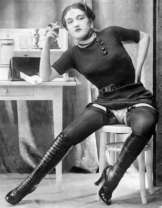 Charles Gates Sheldon :: Jazz Age, model with Fox shoes, 1920’s. A fashion forward and risqué jazz age view of a pair of laced up high heeled woman’s stylish shoes, with the model’s dress hiked up to reveal her stockings. / src: Grapefruit Moon Gallery