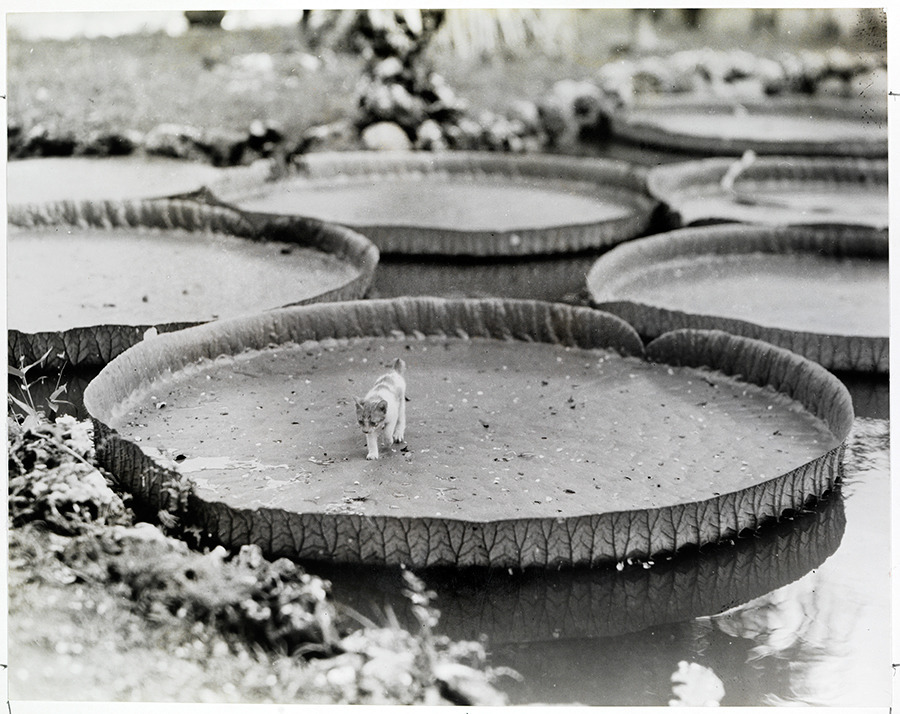 A kitten aboard a floating giant Victoria water lily pad in the Philippines, 1935. / src: National Geographic Found