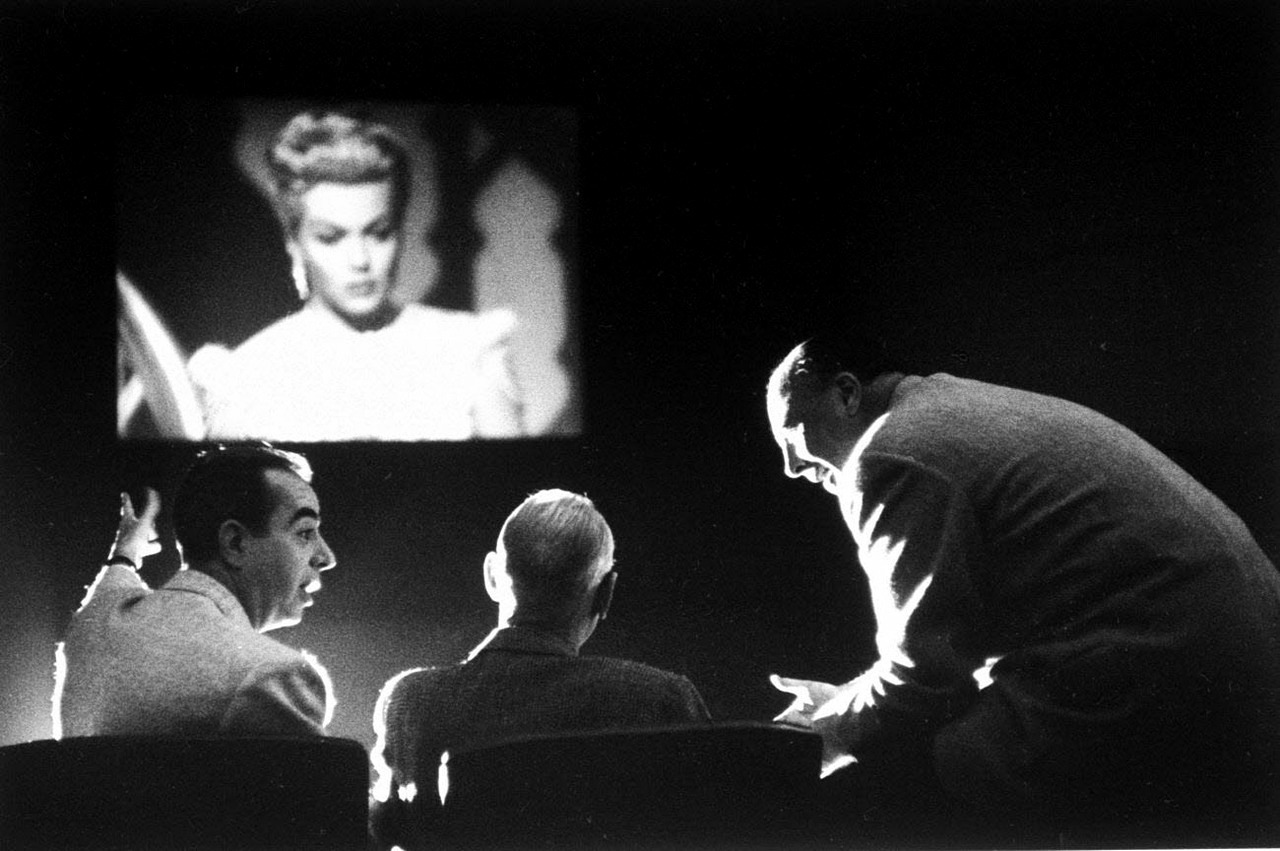 Director Vincente Minnelli talking with two other men while screening a scene featuring Lana Turner from his film The Bad and the Beautiful, 1952