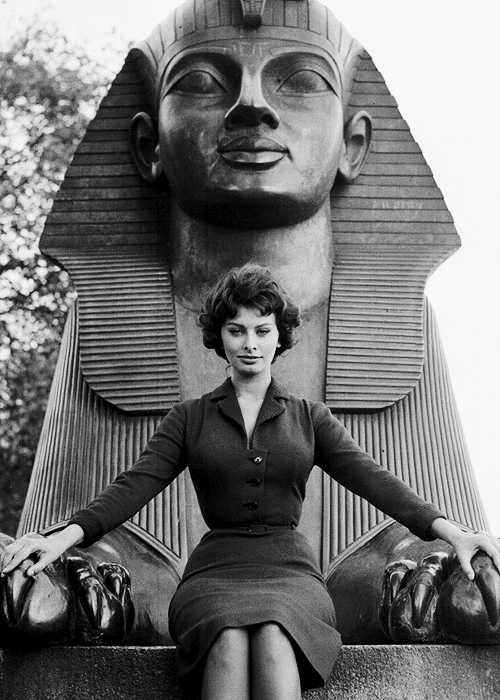 Sophia Loren posing before the Cleopatra’s Needle Sphinx in London, 1957 | via wehadfacesthen