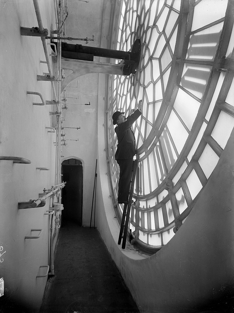 Gentleman in bowler hat inspecting the clock in Elizabeth Tower in the Houses of Parliament, London, 1920′s [some call this photograph “Inside the Big Ben”, but Big Ben is the nickname for the Bell, not the entire clock] / image src: smartage