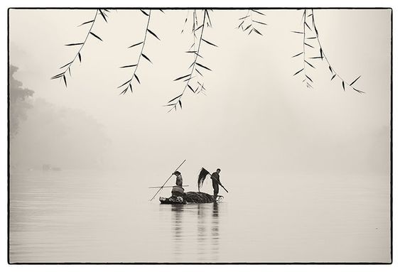 Mike Langford :: Unknown title. Fishermen are from the Intha hill tribe. Men in a straw hat rowing his boat with one oar and his feet, Inle Lake, Myanmar / src: ML more [+] this photographer