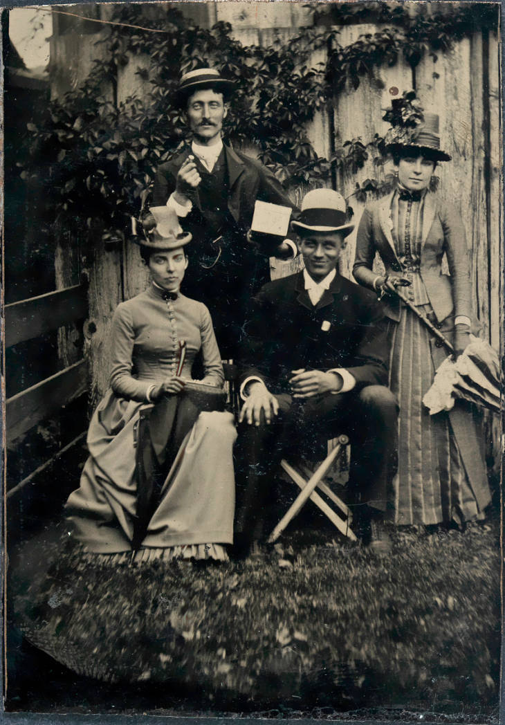 Tintype, from the collection of Carol Cronk Cole: “C. Pirnie + Carrie Patten Cronk, rear. Mr. + Mrs. Hammon, front – on wedding trip. July 1886. / via back then / Source: Public Library of Cincinnati and Hamilton County