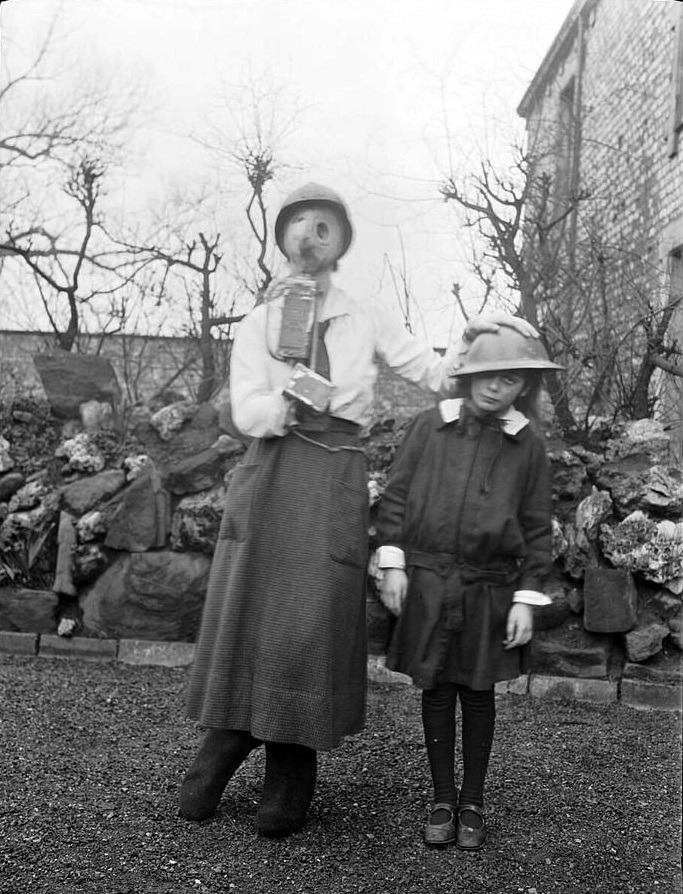 Michael Terry :: Michael Terry’s sisters, Frances and Charlotte, wearing his Russian gas mask and tin hat, Benwell, England, December 1918 / source: