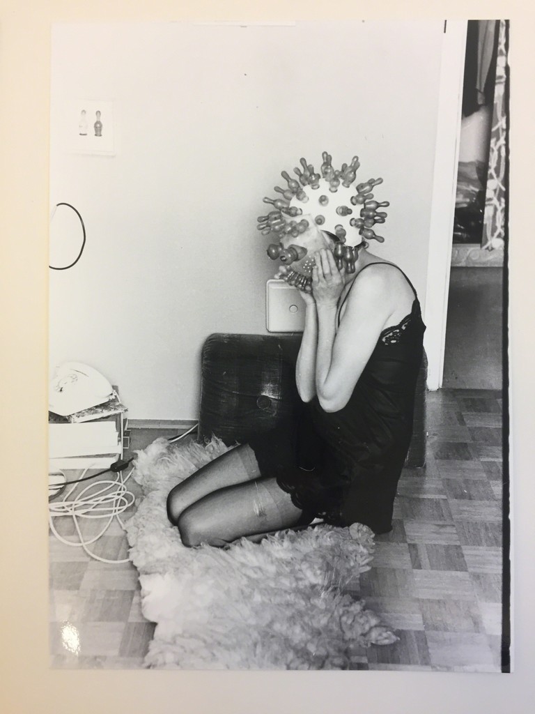 Renate Bertlmann :: Zärtliche Pantomime. | Tender Pantomime, 1977. | src Richard Saltoun | Renate Bertlmann began using rubber teats, rubber baby bottle nipples and condoms as substitutions for genitalia. These were also grafted onto wearable items, such as the crown or wig of udder-like nipples seen here.