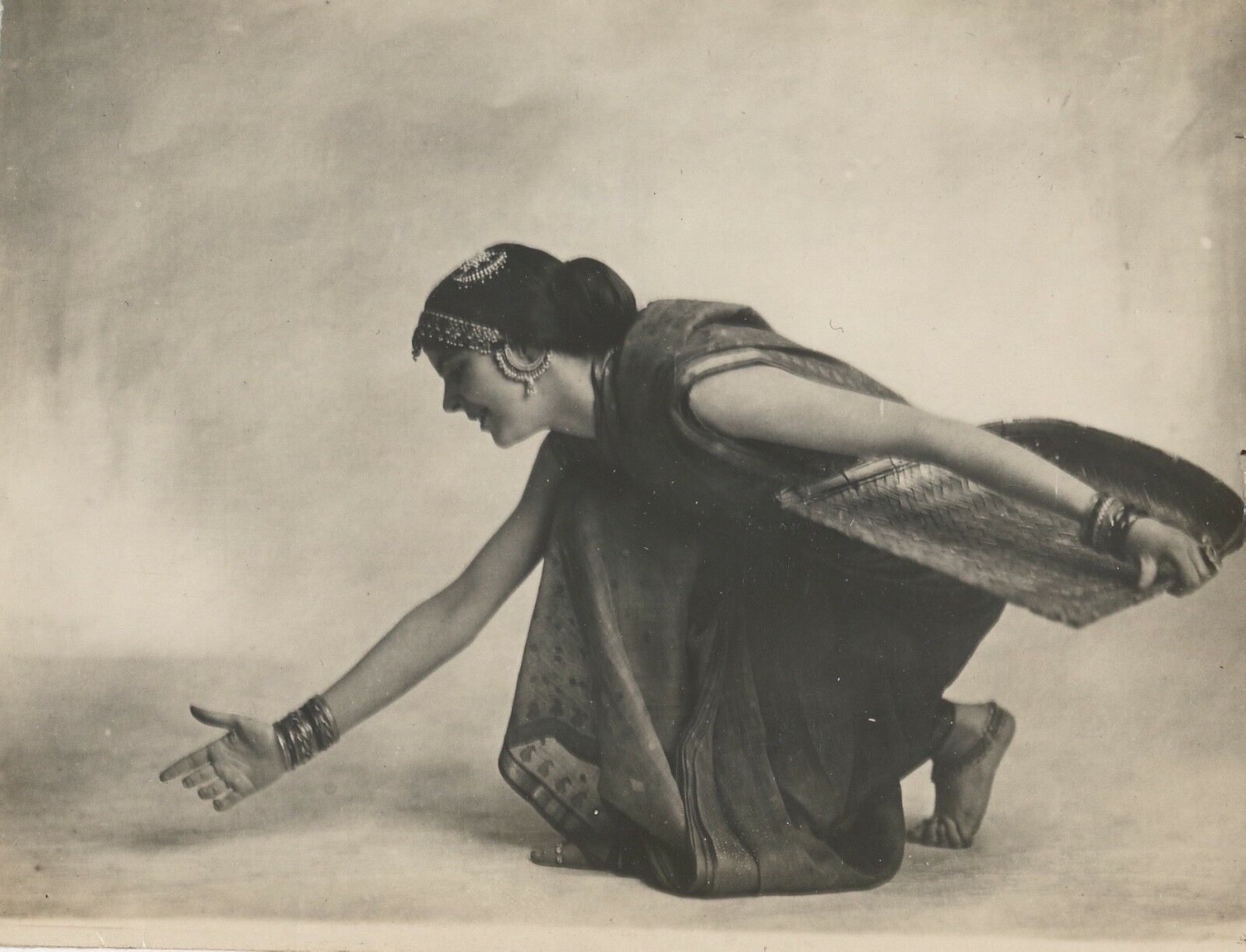In 1926, the reviewer Alma Talley wrote in The Dance magazine: ‘Roshanara has brought to the Western World the spirit of Central India as no one else has ever been able to bring… India’s dances were a part of her soul. She devoted her life to perfecting them, as an artist in water colours gives years of study to making his art as nearly perfect as perfection is humanly possible.’ Craddock adopted the name ‘Roshanara’ in 1909, as she left India, after the Mughal princess and Shahjahan’s daughter, which meant ‘Light-Adorning’. This would go on to be her stage name. In 1911, Craddock (now Roshanara) studied under Carmen Tórtola Valencia, the Spanish dancer and choreographer. She also danced with American actress and dancer Loïe Fuller’s company and shortly after, performed in the play Kismet directed by Australian actor and writer Oscar Asche at the Garrick Theater in London. She also starred five times as Zobeide in Schéhérazade for the Ballets Russes at Covent Garden, London.