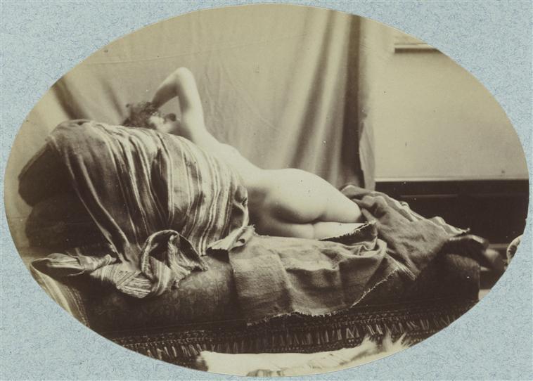 “Naked woman on her back, lying on her left side, ca. 1870. From a model photograph album in an orientalist painter’s studio. Localization: Musée d’Orsay, Paris.” / source: reunion-musees