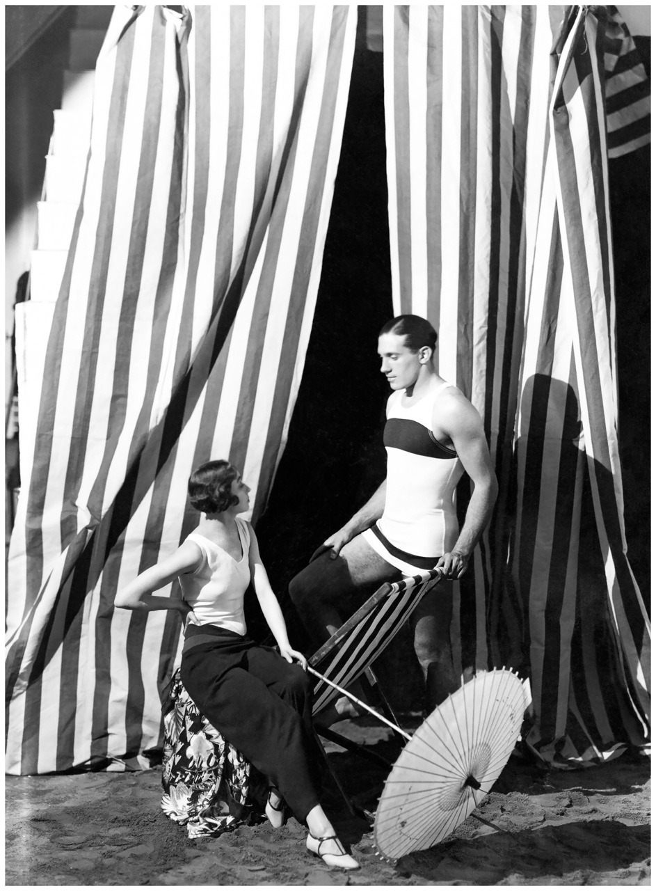 :: Princess Belosselsky in a one-piece beach pajama with white wool jersey tank and black trousers, 1928