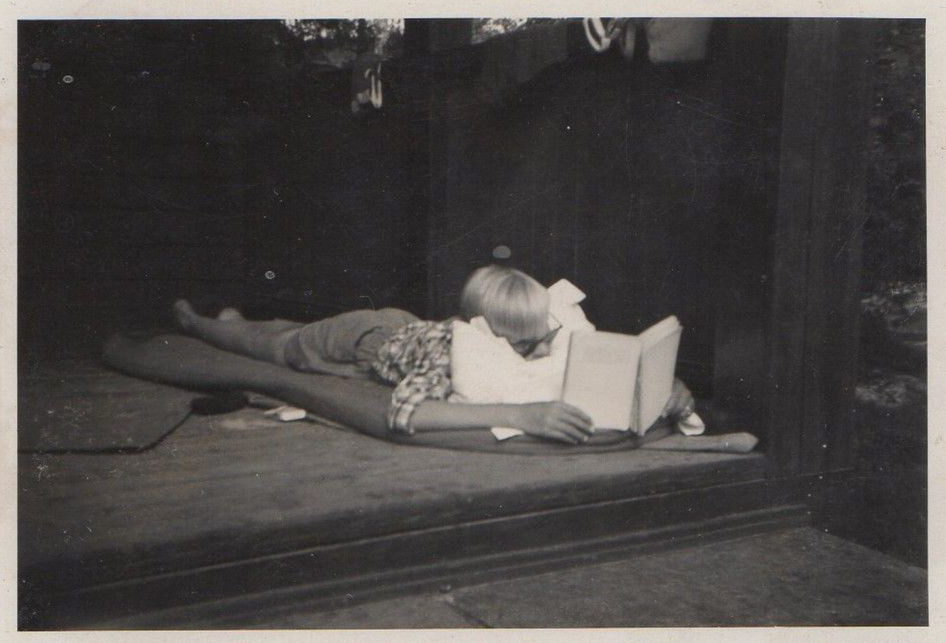 Young woman, head on pillow, lying down on porch, reading a book, vintage snapshot, no date. / source: eBay via gerda-kay