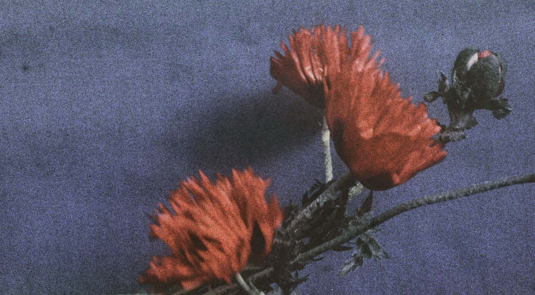 Photo on a small glass panel. Color. Photo of orange California poppies with additional purple flowers throughout the upper left corner of the background. Additional Description: Assumed to be an original lantern slide / autochrome by Harold A. Taylor, California photographer and resident of Coronado for many years.