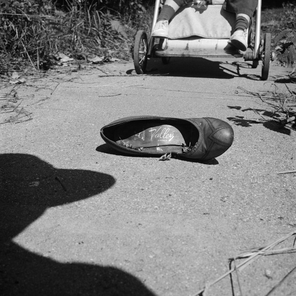 Do my feet look big in these? A young girl pushes her toy pram while wearing Dad’s huge shoes, Great Manchester, England, 1960′s / src: livejournal