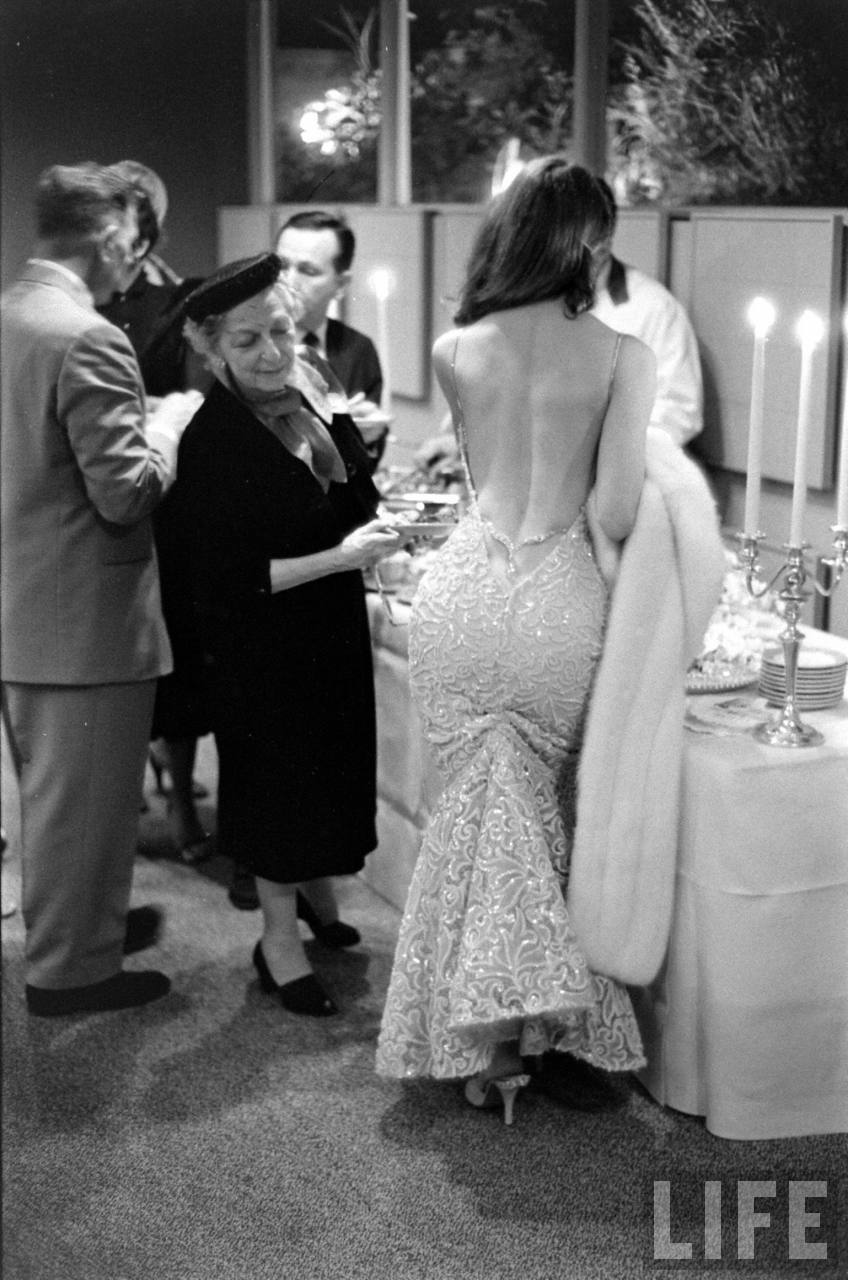 Ralph Crane :: Vikki Dougan in backless dress under the scrutiny of an old lady, 1957 [for Life Magazine]