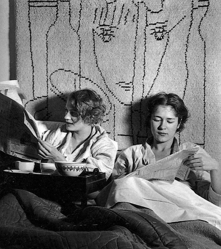 Theodore Miller :: Lee Miller and Tanja Ramm: breakfast in bed at Lee’s Paris studio, 1931. The wall hanging’s a Jean Cocteau design. | src