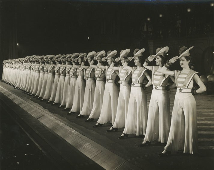 The Rockettes on stage cut a sharp, diagonally receding line—in white and top hats—against the dark backdrop. Originally just one line of dancers, the Rockettes today encompass two 40-girl casts, 1937 (Bettman Corbis) / source: vanityfair.com