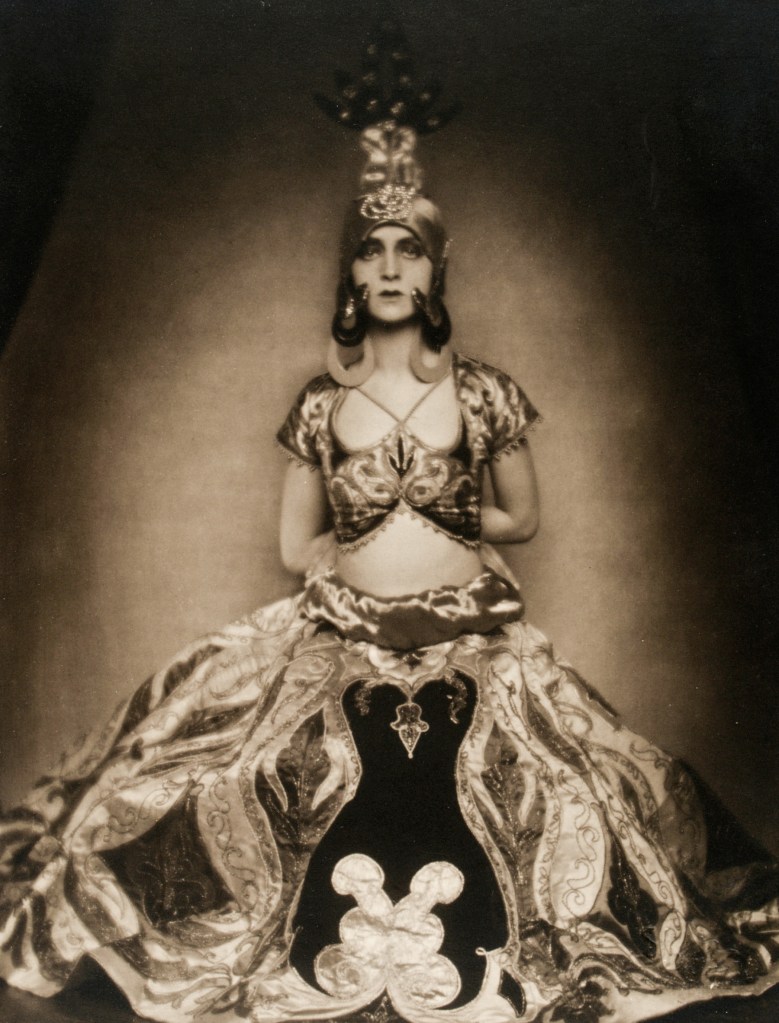 Full length portrait of dancer Ruth St. Denis wearing a flamboyant dance costume, unknown date (1920s). | src Broadway Photographs
