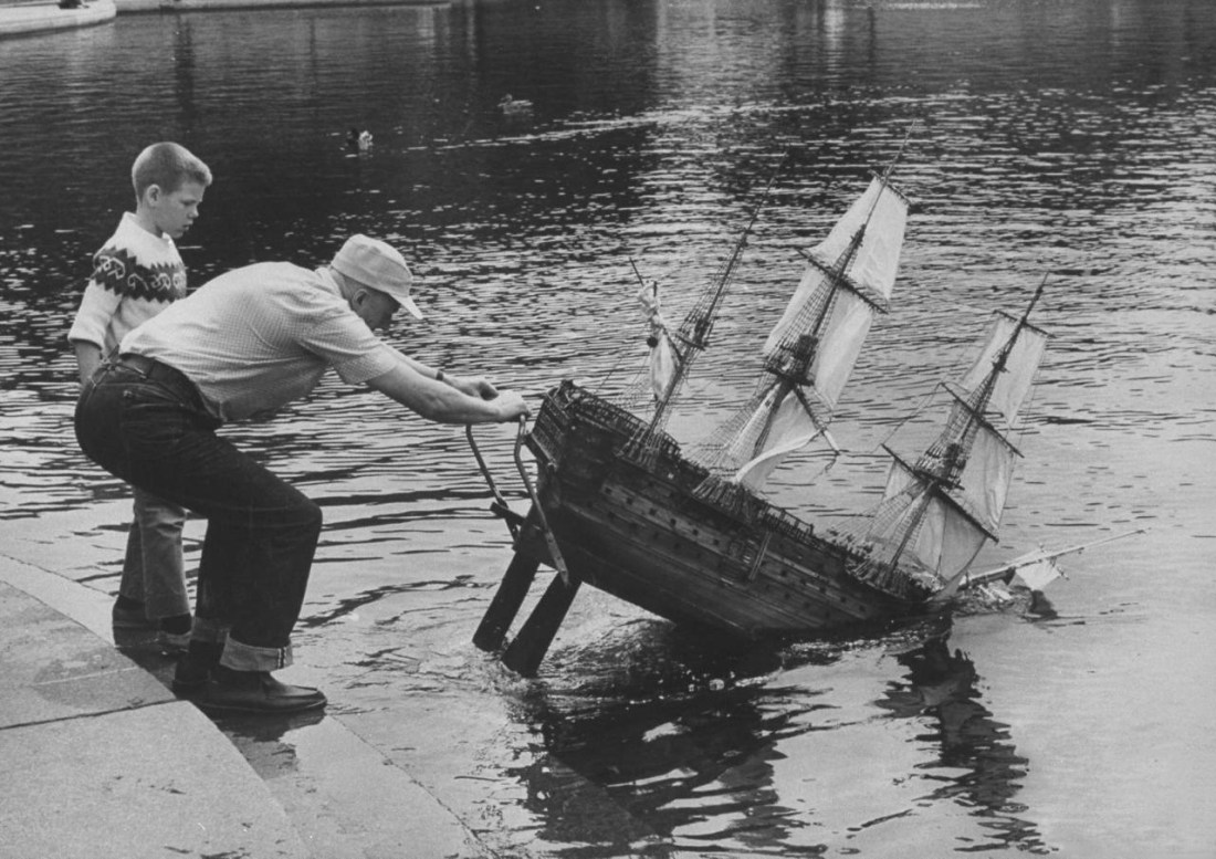 Arthur Langton floating a model ship in Central Park, NYC, June 20, 1961. For Life magazine. / src: Time-Life