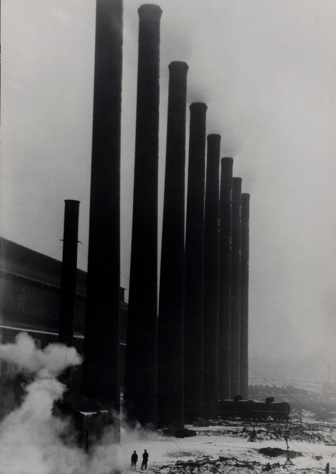 Margaret Bourke-White :: Smokestacks and train, 1927. | src
