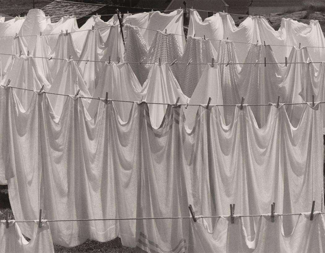 Alvarez Bravo made many images of linens and clotheslines, exploring the interplay between draped fabric and angular architecture. Here, the addition of a figure, seemingly engaged in a performance, adds mystery and animation to an otherwise formal study. | text: Getty museum