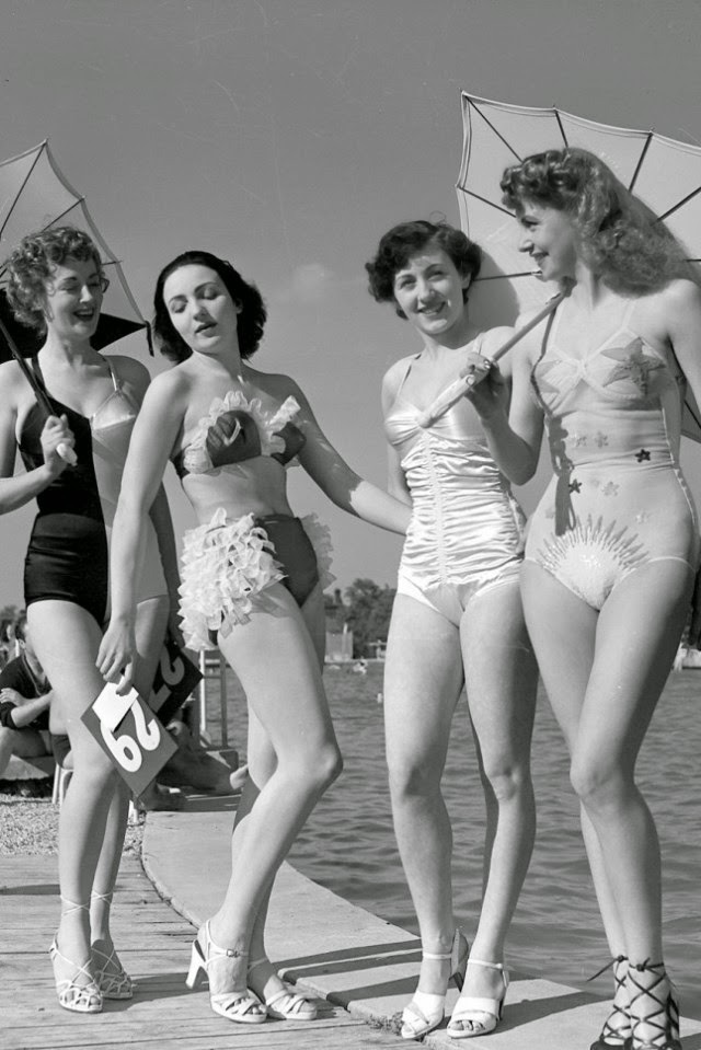 While the trend has barely changed, little details show the differences in taste. The swimsuits were a lot more modest than the ‘barely there’ styles of today’s fashions. These 1950′s bathing beauties prepare for action at the Margate Lido – they seem to be partaking in some form of dressing-up game, the exact details, rules and outcome sadly long lost. (Photo: Mary Evans Picture Library) / src: The Mirror