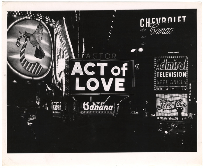The most iconic sign designed by Artkraft Strauss: the smoke-billowing sign for Camel cigarettes featuring a man holding a cigarette, his mouth producing gargantuan smoke rings. The circles were actually steam pumped from the Con Ed building’s heating system. [Times Square, NYC, ca. 1950]