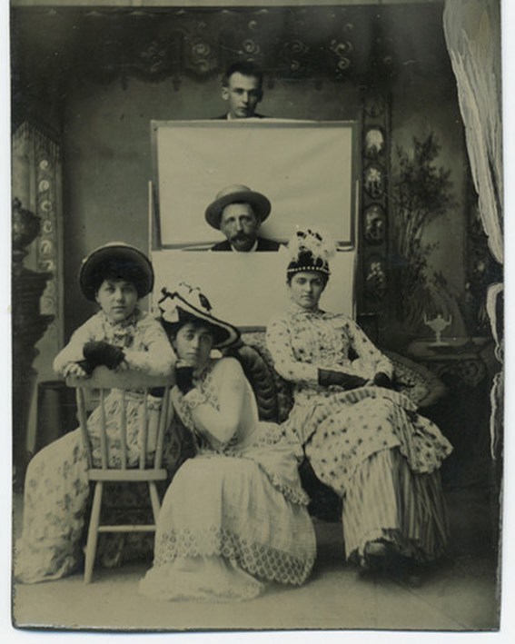 Three women and two men, studio photography. Tintype. / src: foundphotographs.com