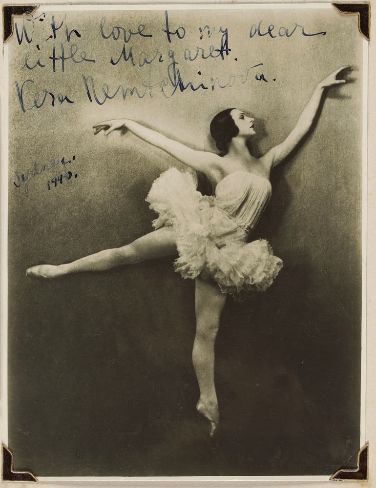 Dancer Vera Nemtchinova, 1940. The dancer performs an arabesque in a short tutu.Biographical/Historical note: The Ballets Russes Australian season was from 30th December 1939 to 19 September 1940. / source: