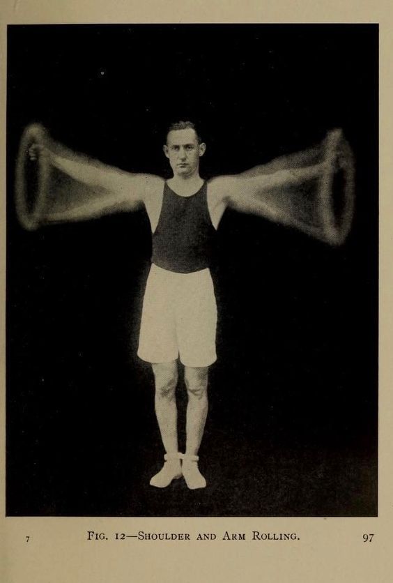 Fig. 12. Shoulder and arm rolling. Physical training for business men, 1917 (Illustration created by photographer A. B. Phelan to accompany H. Irving Hancock’s book: Physical Training for Business Men, 1917) / source: archive.org