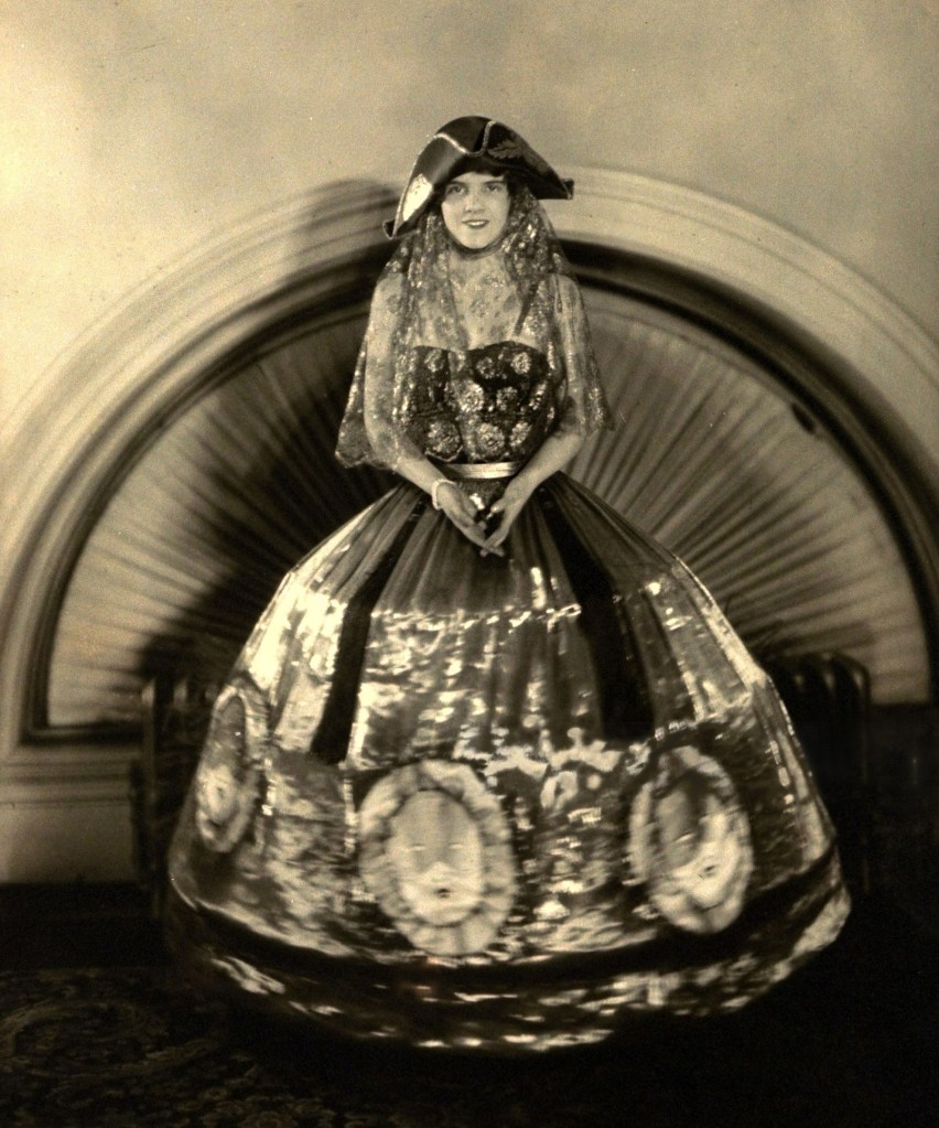 Edward Jean Steichen :: Polly Potter wearing a hoopskirt costume with images of the sun running around the hem, and a tricorner hat with waist-length panels of lace for the annual costume party, the Red and Gold Ball, for the New York Junior League. Vogue magazine, 1926. | src and hi-res Getty Images