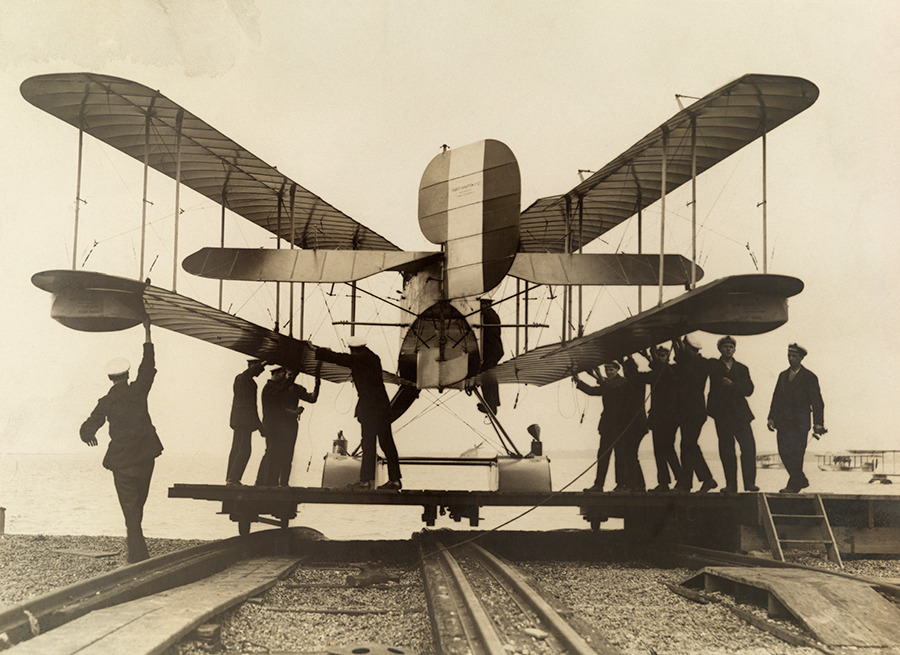 Men inspect a British airplane with folding wings, 1918. Unknown photographer or Agency.
