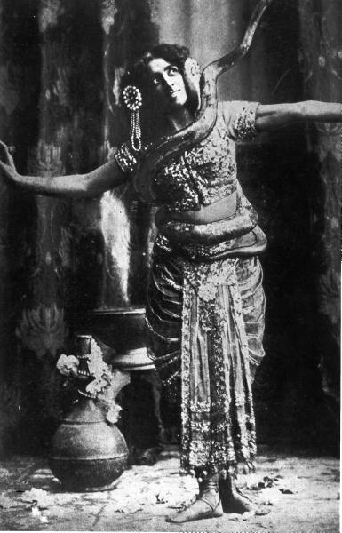 Portrait of Mata Hari (1876-1917), Dutch dancer and spy for Germany during World War I, standing, with snake around her middle, 1915